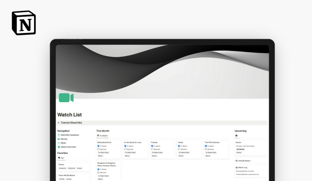 Never miss a movie or show with the Watch List Notion Template - organize what you're watching or want to watch, and track release dates.